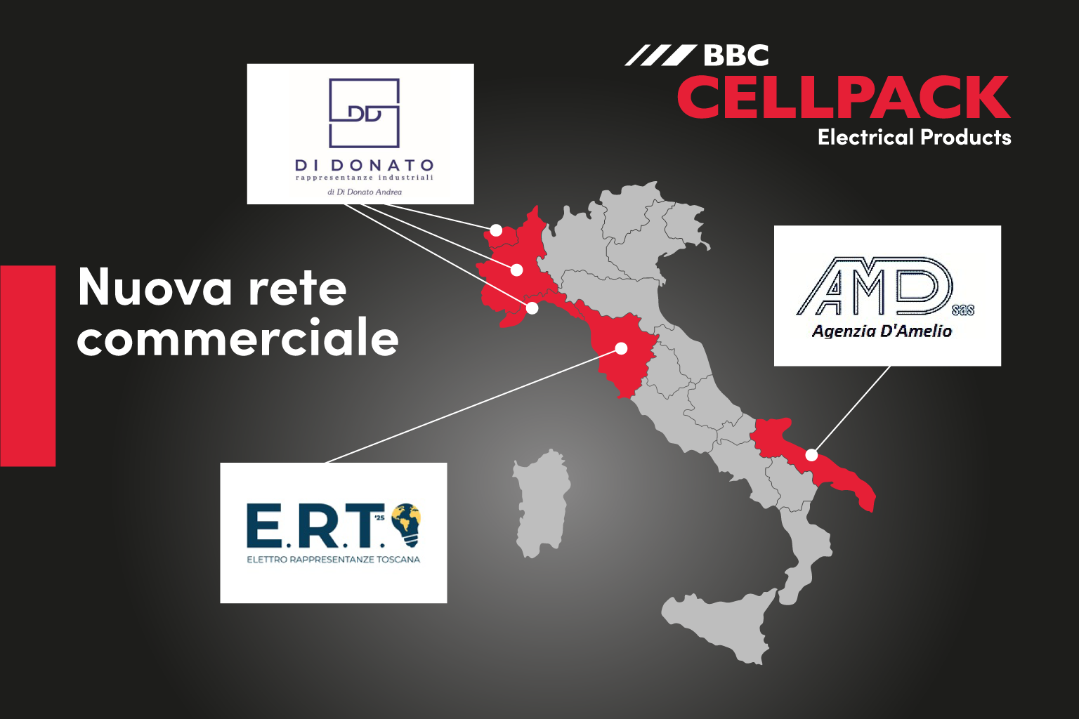 A partire dal 1° gennaio 2026, BBC Cellpack Italia annuncia l’avvio della collaborazione con tre nuove agenzie commerciali per potenziare il supporto sul territorio: Di Donato Rappresentanze Industriali per Valle d’Aosta, Piemonte e Liguria, E.R.T. ’25 Elettro Rappresentanze Toscana per la Toscana e AMD Agenzia D’Amelio per la Puglia.