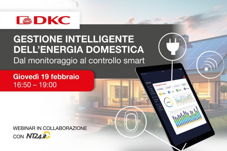 Per approfondire questo scenario, il Gruppo DKC promuove un momento di approfondimento tecnico dedicato agli operatori del settore: il webinar online “Gestione intelligente dell’energia domestica: dal monitoraggio al controllo smart” . L’iniziativa, realizzata in collaborazione con NT24, vedrà l’intervento di Marco Demetri, Product Manager delle Linee Energy e RamBatt.