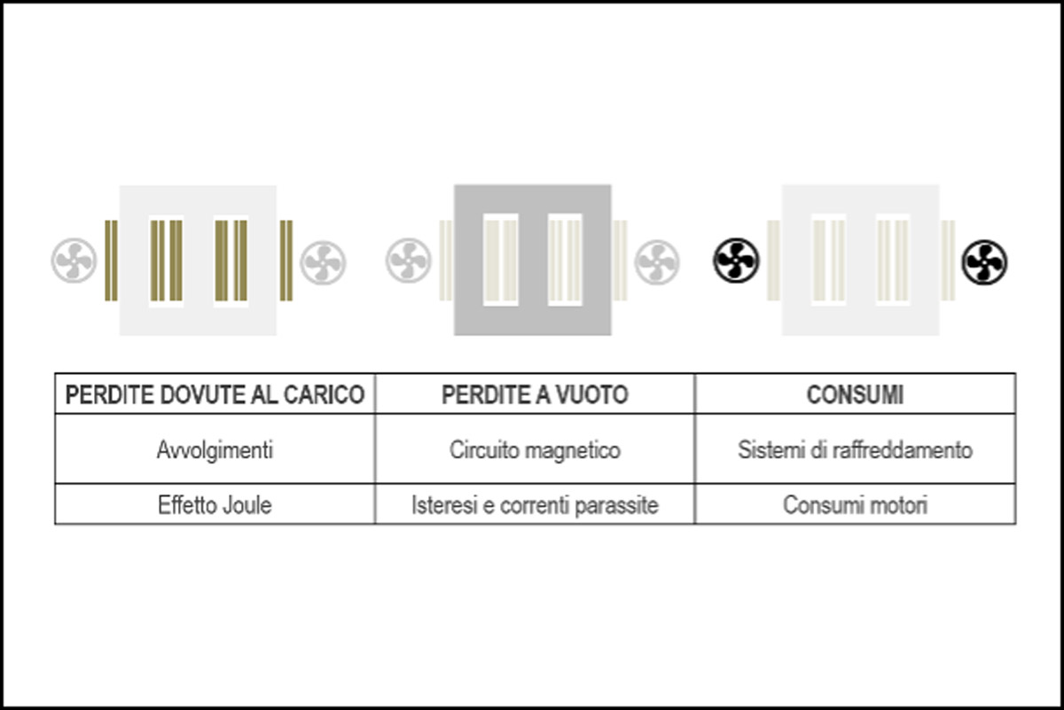 Le perdite nel circuito magnetico sono quelle legate all’isteresi e alle correnti parassite nel nucleo e dipendono dalla tensione di alimentazione. I consumi dei sistemi di raffreddamento tradizionalmente non erano computati tra le perdite, ma di fatto impattano sulla prestazione energetica.